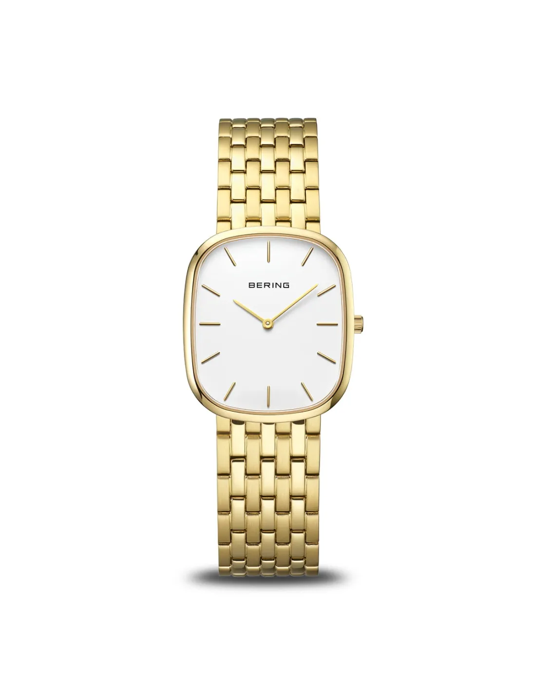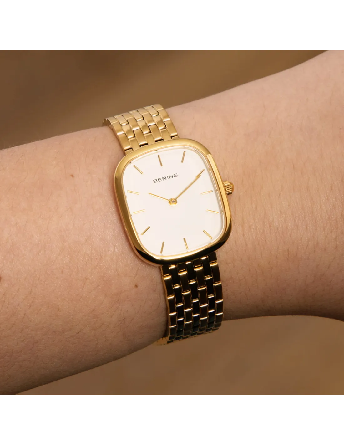 Den let afrundede, rektangulære urkasse i guldfarvet rustfrit stål skaber et moderne og feminint udtryk. Den lyse sølvfarvede urskive afspejler den arktiske klarhed, som kendetegner BERING, og står i smuk kontrast til de slanke, guldfarvede visere og indeks. Det minimalistiske design giver et roligt og harmonisk helhedsindtryk. Den guldfarvede lænke i rustfrit stål fuldender uret med komfort og elegance.