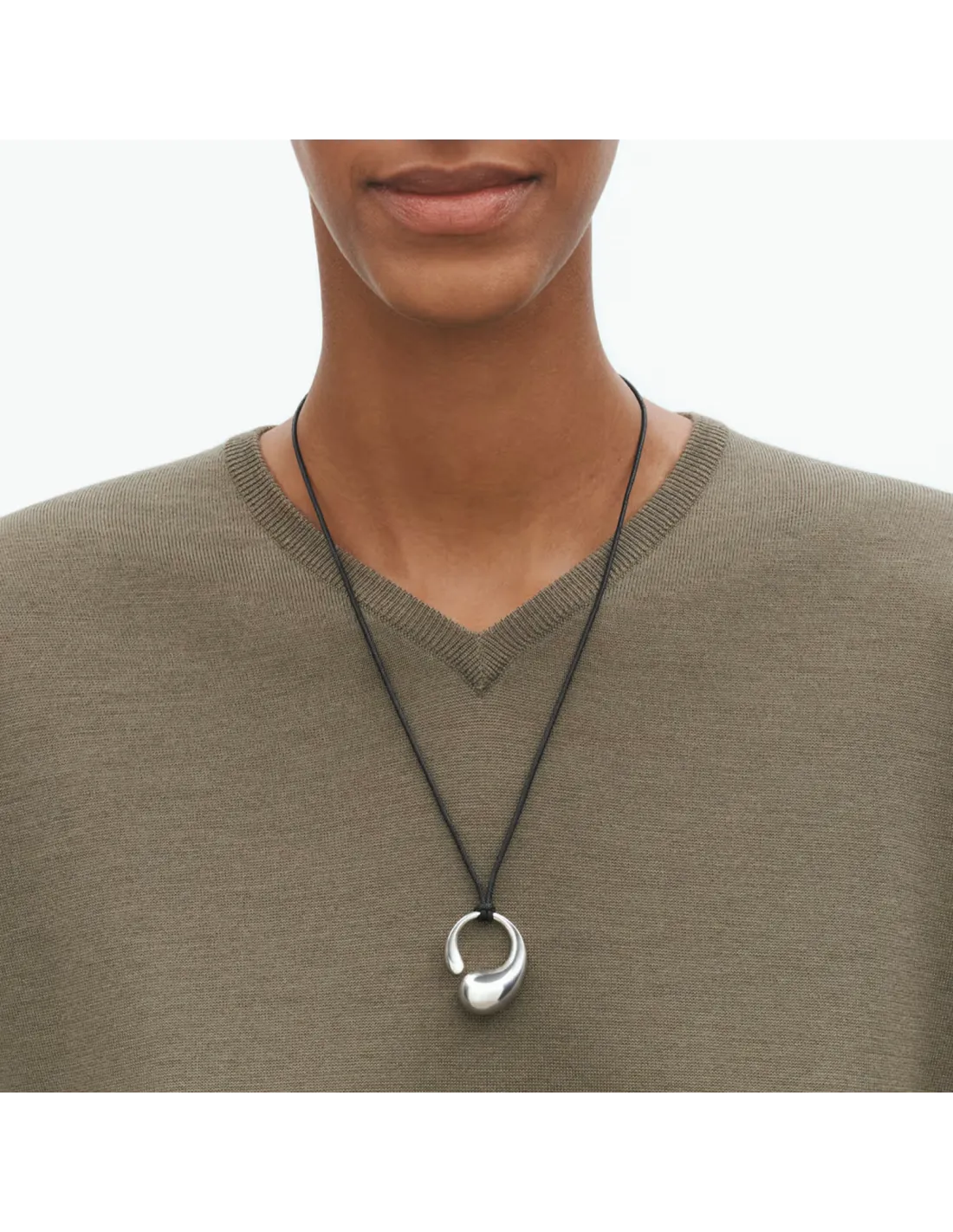 De bløde, organiske linjer i Jacqueline Rabuns Mercy ring bliver fortolket i dette vedhæng af sterlingsølv. Vedhænget bæres i en voksbehandlet bomuldssnor med ender af sølv for et elegant udtryk. Mercy kollektionen blev introduceret i 2019 og rummer en dyb symbolik. Serien henter inspiration i timeglassets facon til de skulpturelle smykker, som bliver et billede på tiden, der går.