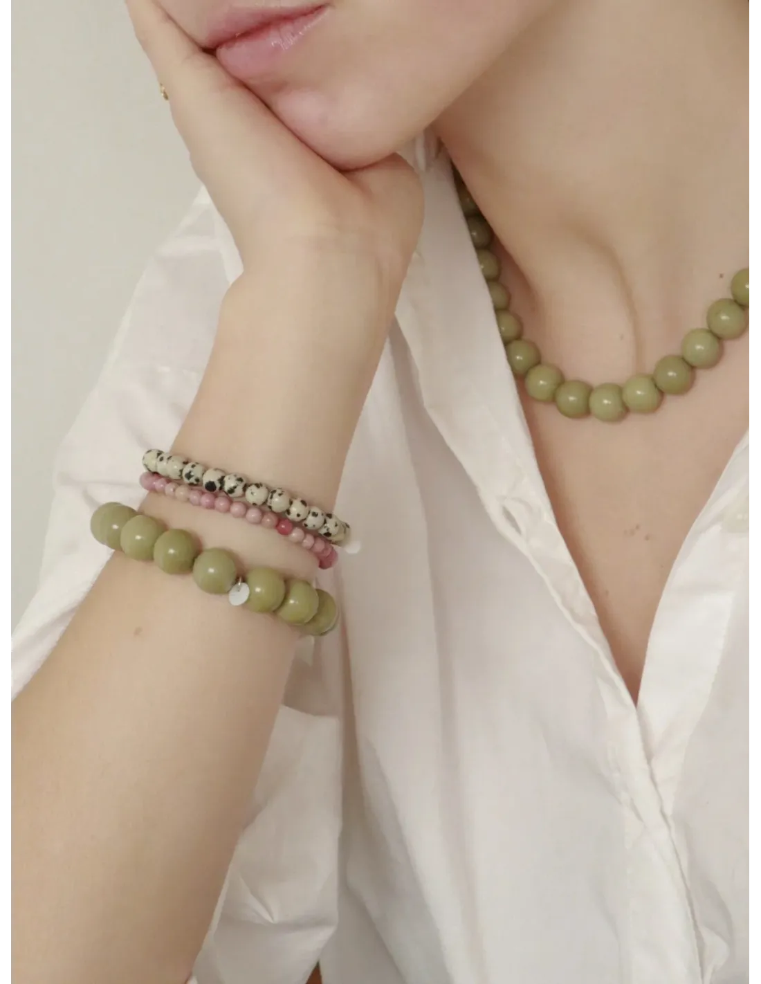 De bløde rosa nuancer symboliserer kærlighed, forståelse og styrke i sårbarhed. Lavet med omhu og præcision er armbåndet mere end blot et smykke; det er et udtryk for balance og naturlig skønhed.