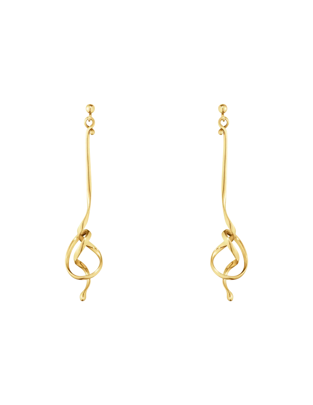 Disse øreringe er nænsomt formet af en enkelt tråd i 18 karat guld og har et nedtonet skulpturelt udtryk. De er designet af Vivianna Torun Bülow-Hübe – den første kvindelige sølvsmed, der åbnede eget værksted i Sverige. Hendes Forget-Me-Knot kollektion stammer fra 1971 og er kendt for sine snoninger og kurver.