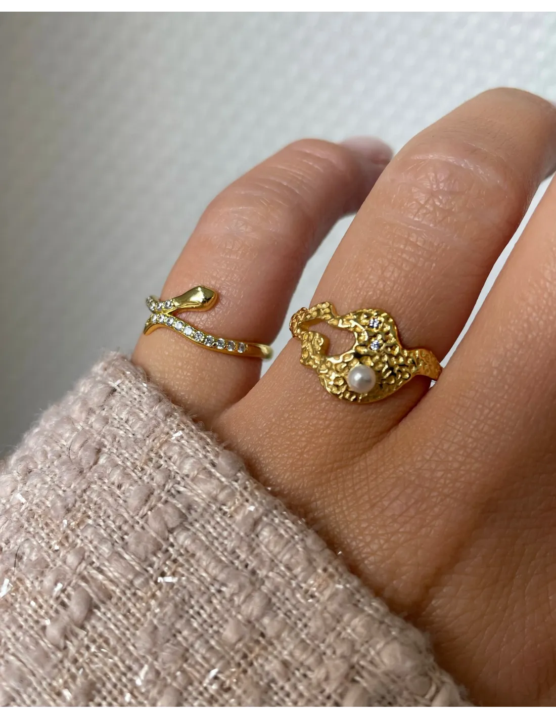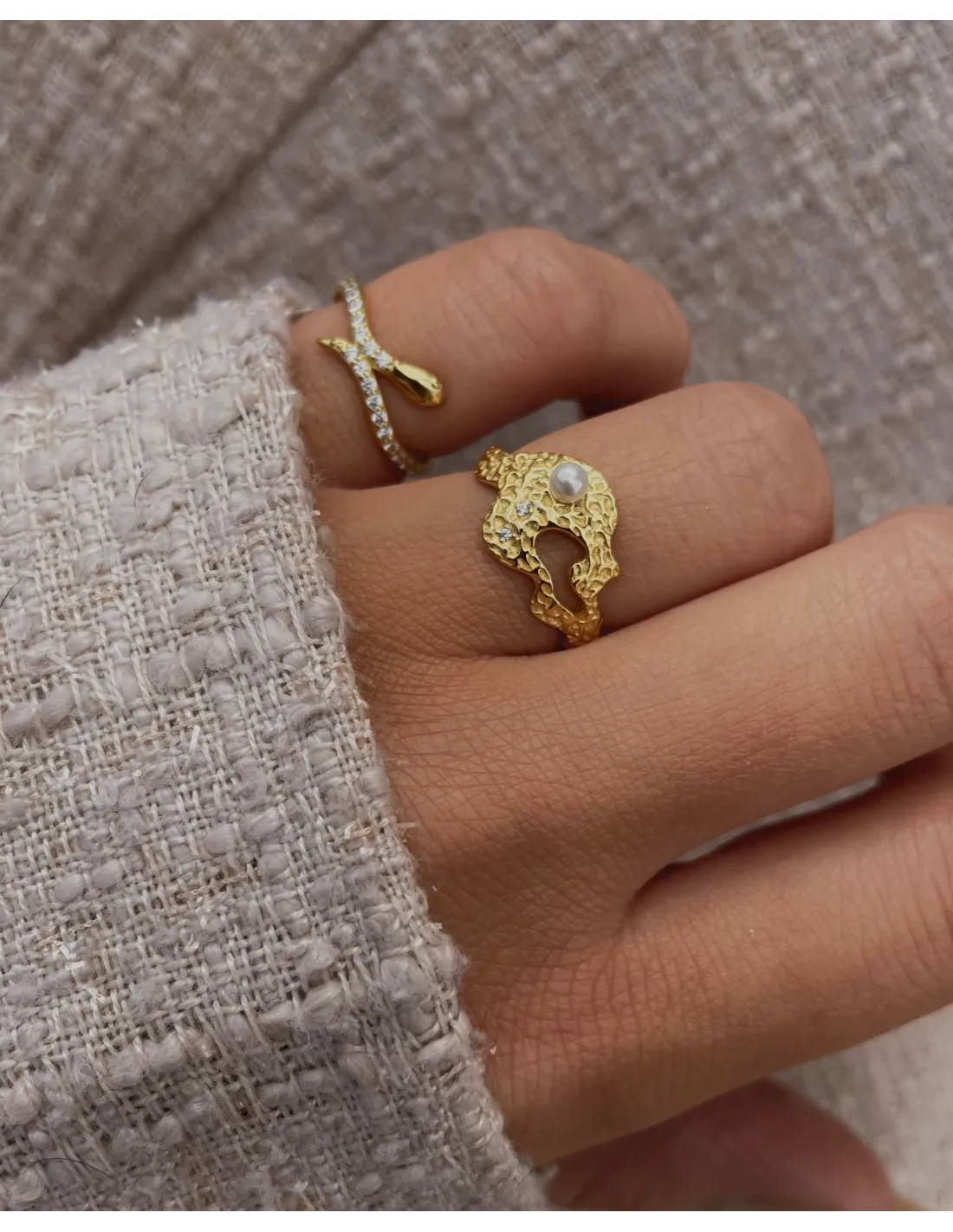 Adira Ring er en smuk statement ring med et tidsløst design. Ringen har en organisk banket overfalde med både perler og sten. Ringen gør sig godt alene, da den er chunky, men kan også nemt styles med andre styles. En perfekt tilføjelse til ethvert outfit. Adira Ring er en del af Reef kollektionen, som er inspireret af det smukke koralrev.