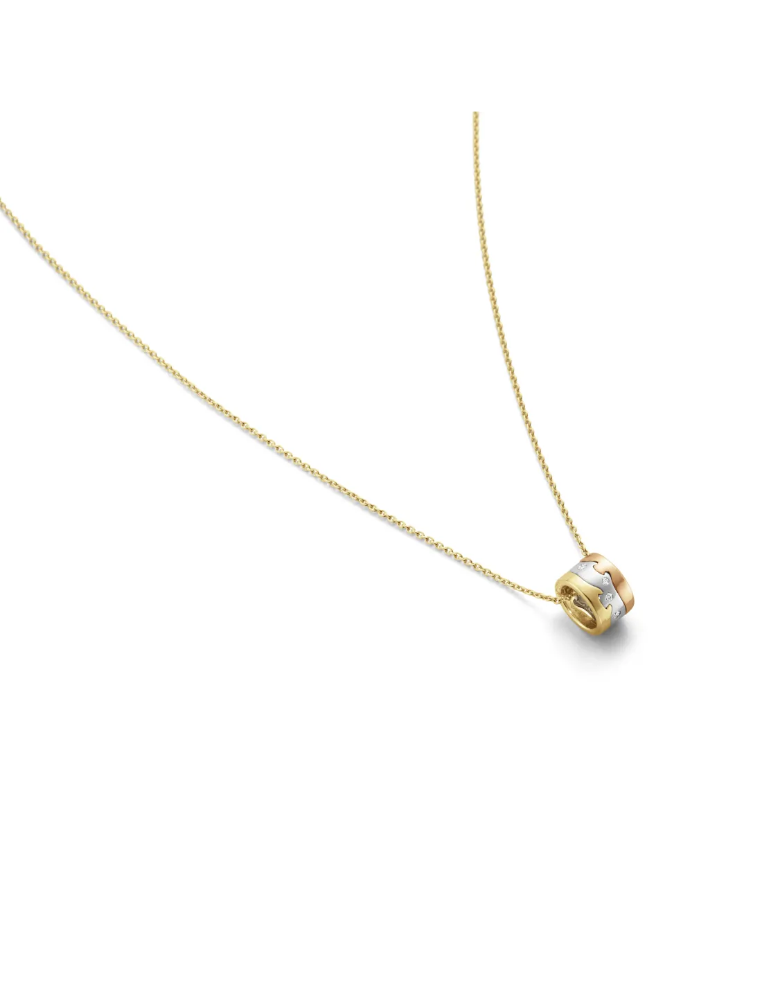 Fusions vedhænget består af både 18 karat rosaguld, almindeligt rødguld og en midte af hvidguld der er paveret med 0.05 ct. brillantslebne diamanter.