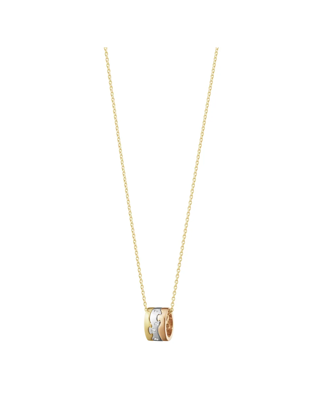 Georg Jensens fusion vedhænget er monteret på en 18 karat rødguldkæde i 45 cm, der fremhæver designet og farvespillet mellem elementerne på bedste måde.