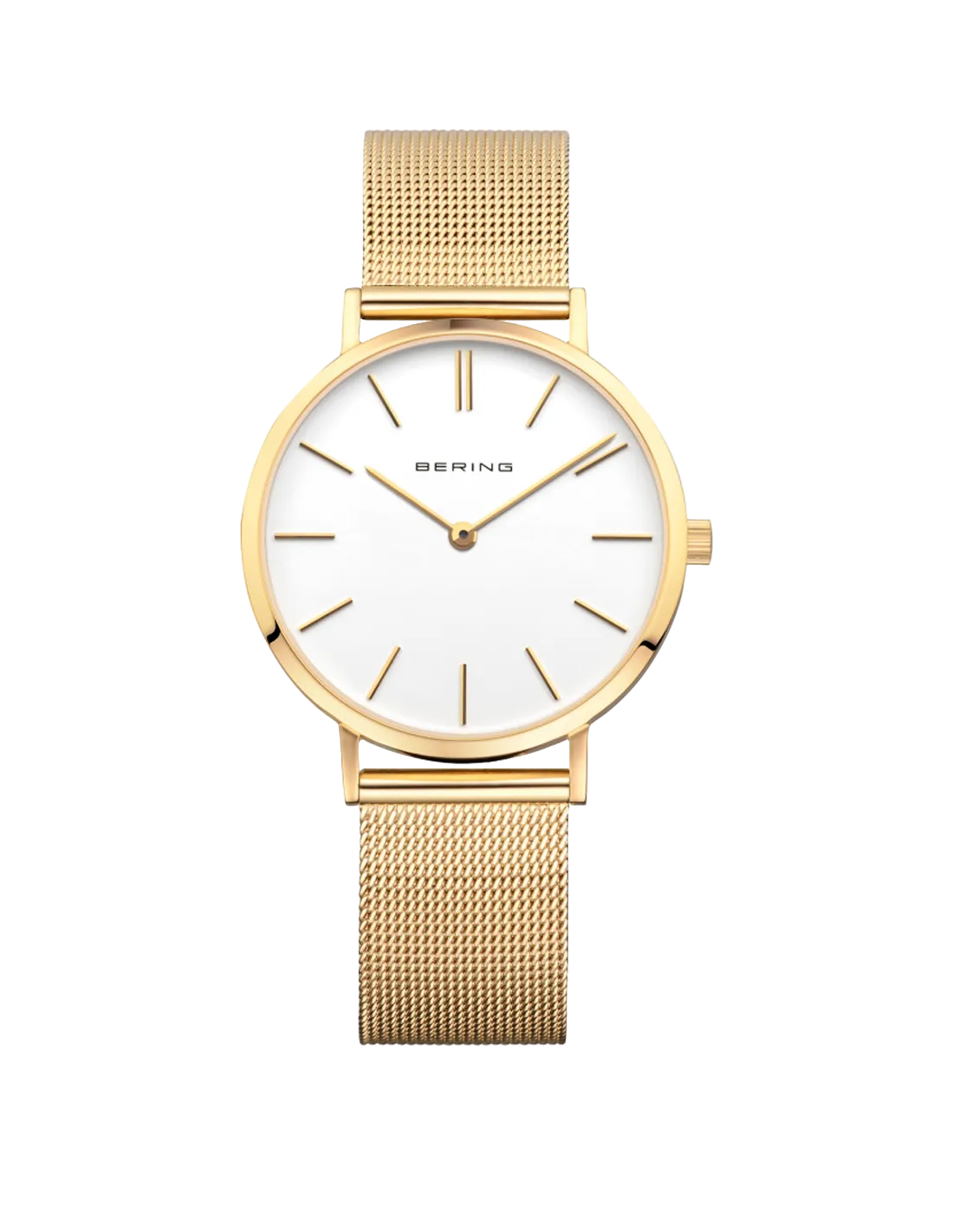 Klassisk dansk design med et moderne minimalistisk udtryk - BERINGs CLASSIC COLLECTION. Glansfuld guldfarvet urkasse af rent rustfrit stål (316L), som også anvendes inden for medicinalindustrien. Moderne guldfarvet mesh lænke giver højeste bærekomfort. Minimalistisk urskive, beskyttet af et særdeles hårdt, krystalklart og ridsefast safirglas. Giver det klassiske BERING look.