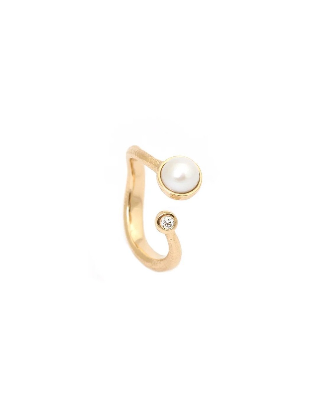 Denne smukke Ophelia ring smyger sig om fingeren med en elegant hvid perle og diamant i hver side. Overfladen er rustik og ringskinnen organisk. Enkel og elegant.