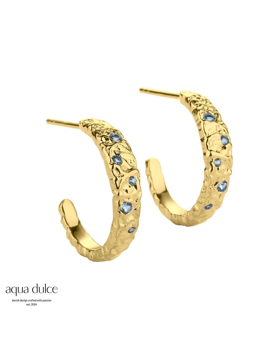 18 mm. creoler i forgyldt sølv med stik , ruflet overflade & fine lyseblå zirkonia.