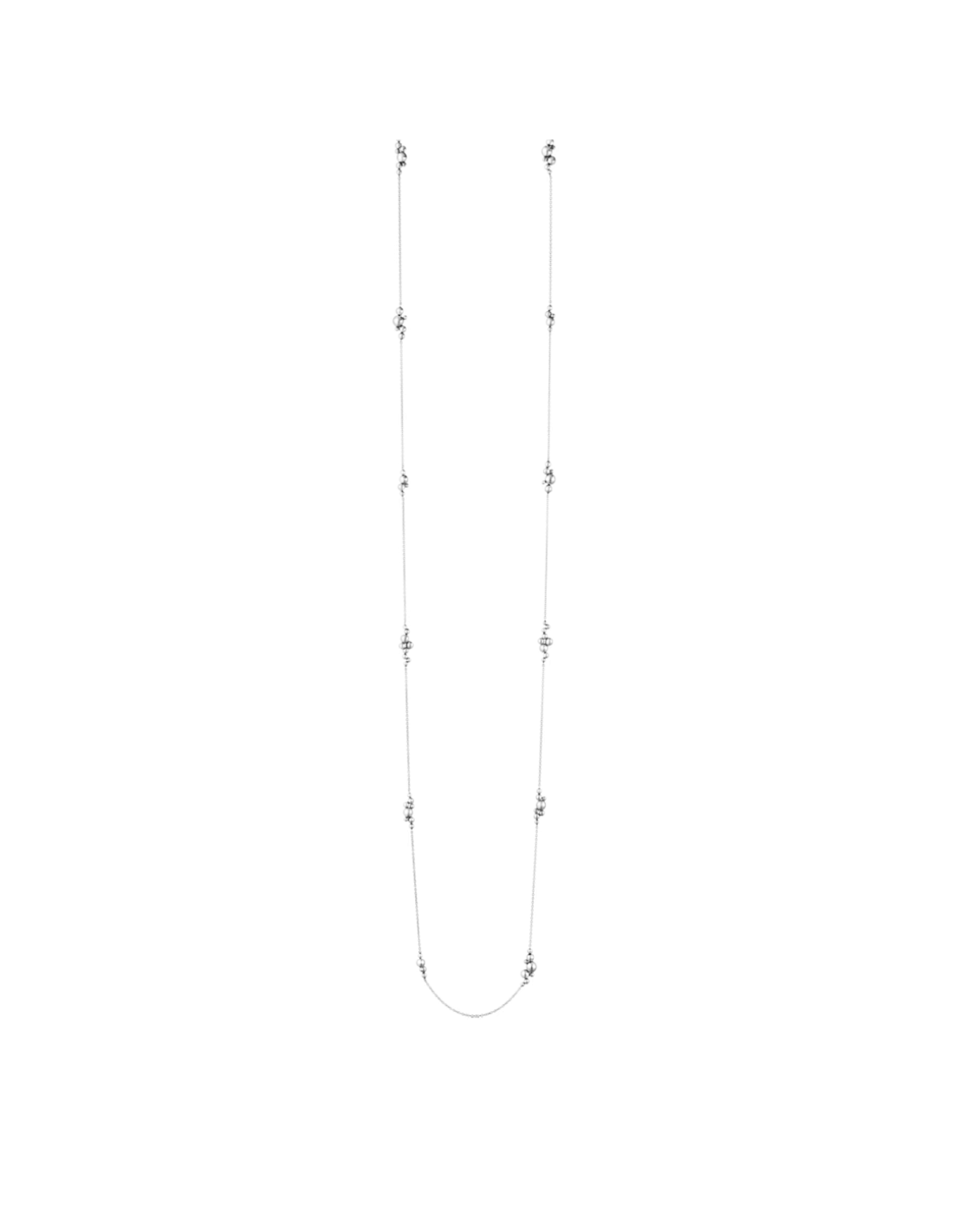 Små sølvkugler samler sig i fine klynger på denne halskæde fra Moonlight Grapes kollektionen. Sølvkuglerne er inspireret af druerne, som Georg Jensen udsmykkede sit sølvhåndværk med i begyndelsen af 1900-tallet. Halskæden giver et strejf af elegance og kan bruges i sin fulde længde eller vikles to gange rundt om halsen. Smykket har en usynlig lås, som er skjult blandt sølvkuglerne.