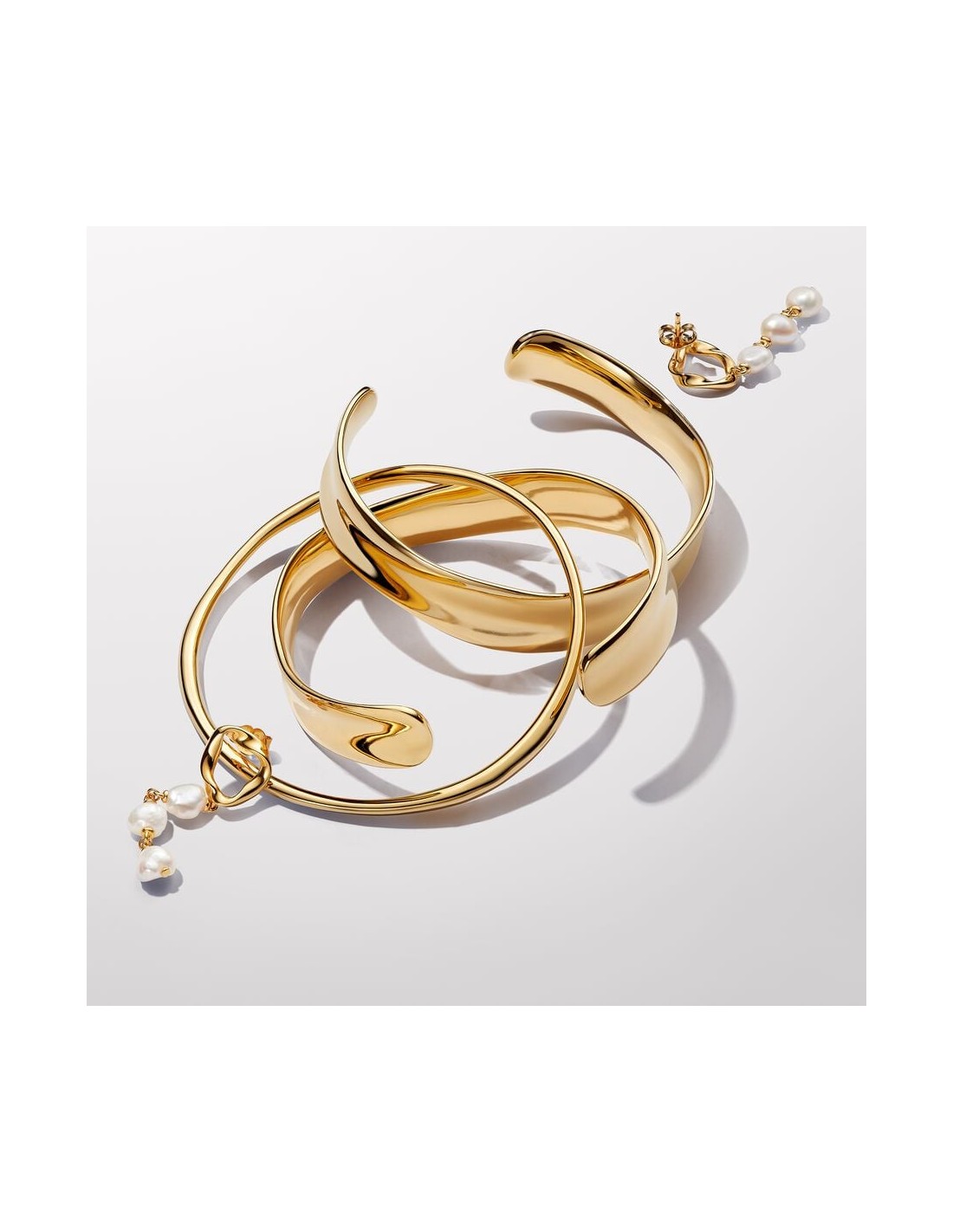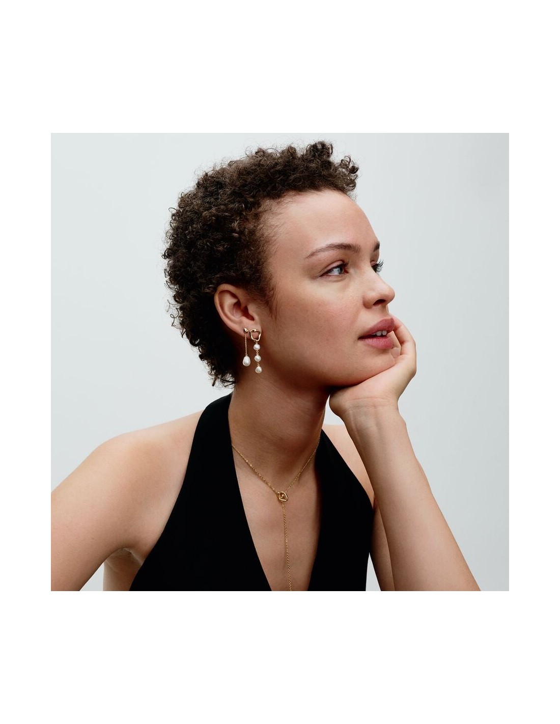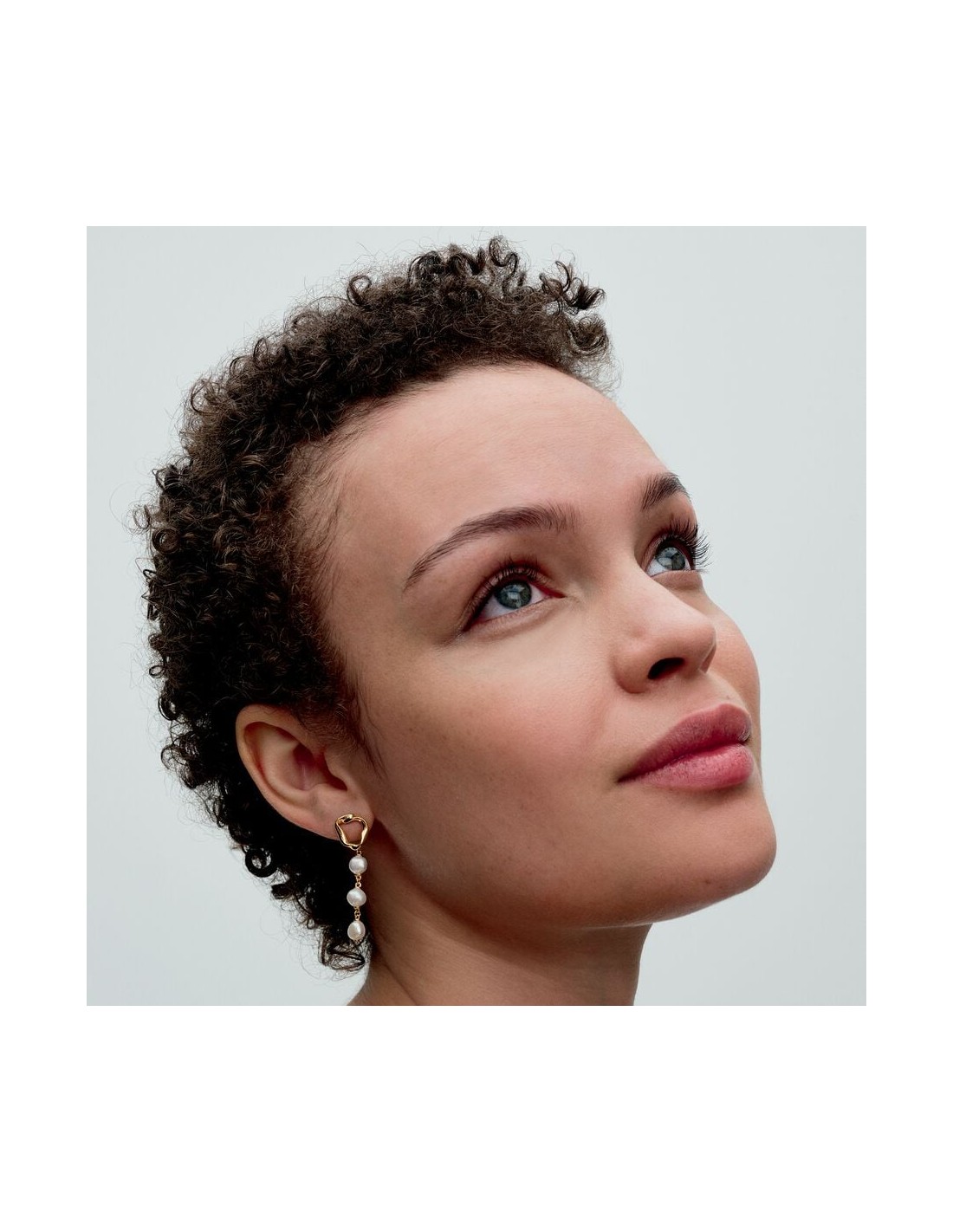 Vi præsenterer en ny slags klassiker med disse drop-øreringe med organisk formet cirkel og barok-behandlede ferskvandskulturperler Hver ørering har tre barok-behandlede ferskvandskulturperler, der hænger fra en organisk 14 kt. guldbelagt cirkel med varierende tykkelse. Bemærk, at hver behandlede ferskvandskulturperle er unik og kan variere i størrelse og farve. Der kan forekomme normal slitage på dette materiale. Vore ferskvandskulturperler er behandlet med blegning og glansforbedring.