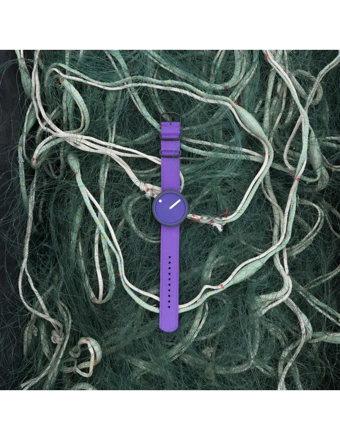 PICTO Ocean Ghost Net 40 mm armbåndsur med roterende urskive og jelly lilla genbrugsplast rem. Kasse lavet af genanvendte fiskegarn, hærdet mineralglas, 5 ATM.