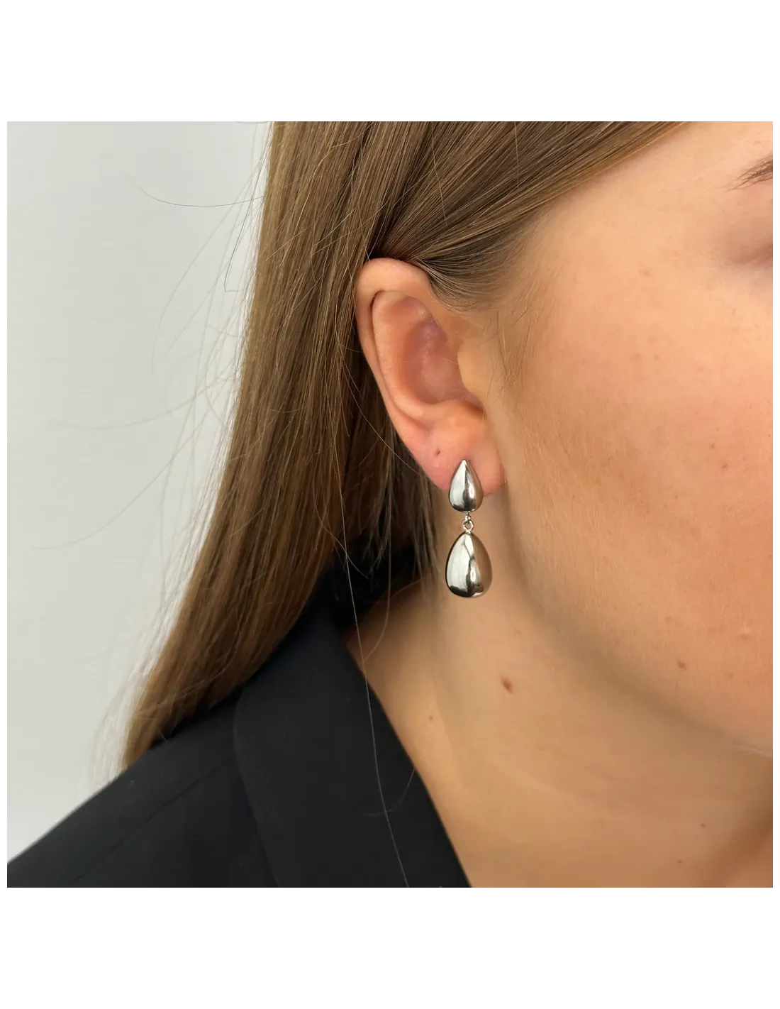 Drop - Øreringe Stål De glinsende, dråbeformede øreringe fra Drop-kollektionen kombinerer feminin udstråling med renhed og elegance. De emmer af dansk, minimalistisk design, når det er bedst, og skaber et smukt blikfang til dit look. Mål: 29 mm Materiale: Stainless steel ♻️ 100% recycled Stainless Steel med holdbar PVD-behandling. Smykket er lavet i rustfrit stål, og belagt med den ekstra holdbare PVD-behandling. Smykket har derfor, i forhold til smykker lavet i andre materialer, en uovertruffen slidstyrke og ridsefasthed. Smykker i rustfrit stål kan både klare sved, vand, fugt og parfume, og er derfor ekstremt holdbare. Se mere under vedligeholdelse af rustfrit stål smykker.