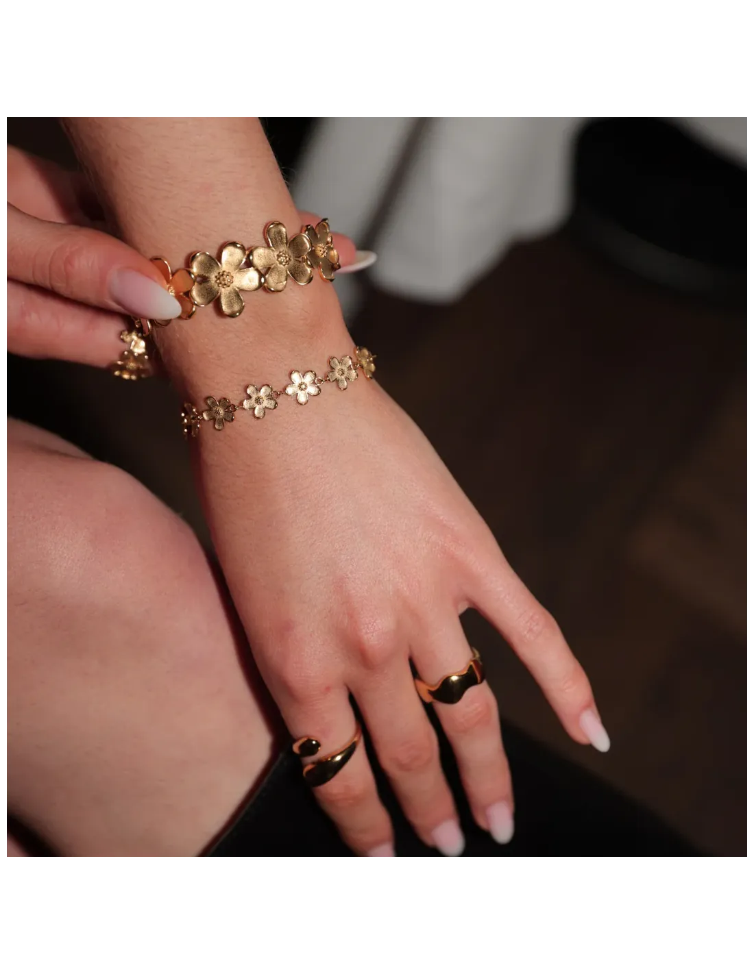 Camellia - Armbånd Forgyldt Camellia-armbåndets romantiske blomsterdesign er skabt til at give din stil et frisk pust af yndig elegance. De er perfekte til et personligt feminint look og passer til enhver lejlighed. Mål: 160 mm Materiale: 18kt. Guldbelagt Stainless steel ♻️ 100% recycled Stainless Steel med holdbar PVD-behandling. Smykket er lavet i rustfrit stål, og belagt med den ekstra holdbare PVD-behandling. Smykket har derfor, i forhold til smykker lavet i andre materialer, en uovertruffen slidstyrke og ridsefasthed. Smykker i rustfrit stål kan både klare sved, vand, fugt og parfume, og er derfor ekstremt holdbare. Se mere under vedligeholdelse af rustfrit stål smykker.