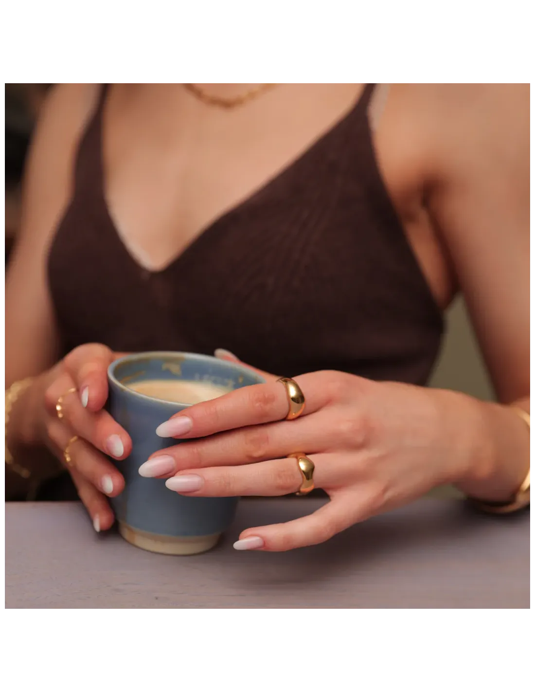 Alle smykker er lavet i genanvendt stainless steel og belagt med ekstra holdbar PVD-coating, som sikrer lang levetid – også i vand. De tåler både klor, saltvand og daglig brug uden at miste glans.