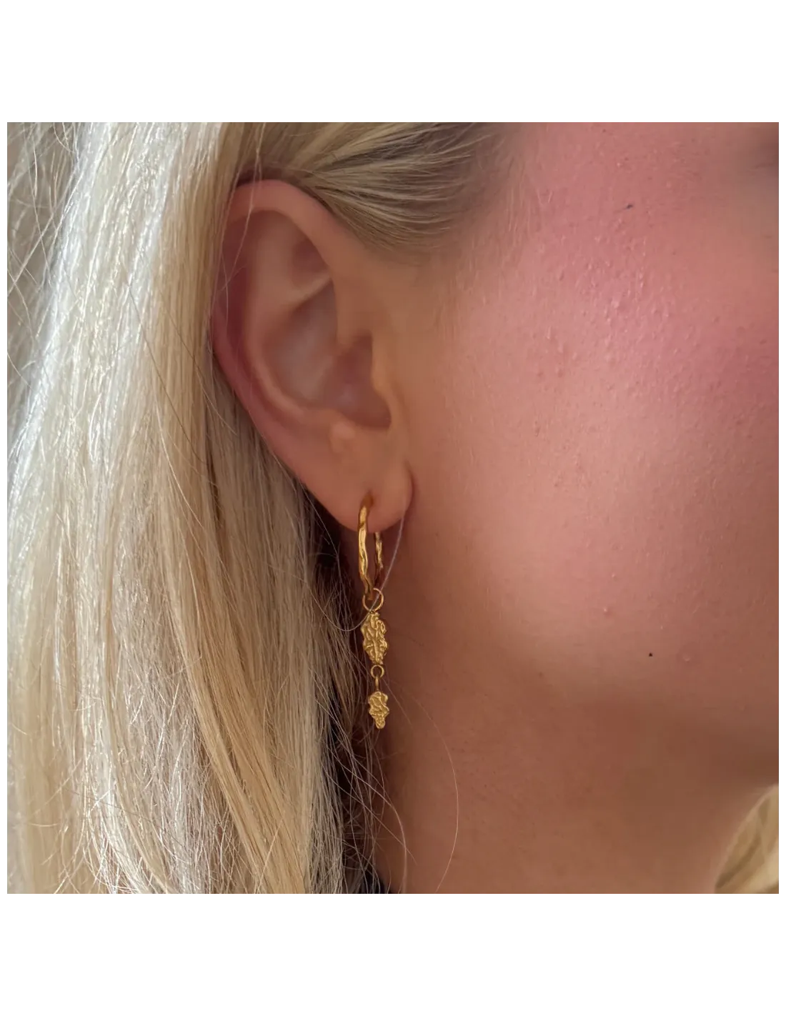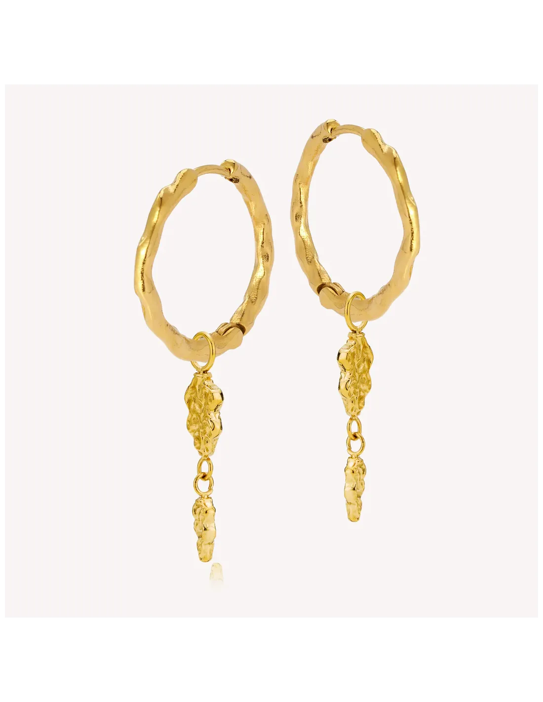 Sophia - Creoler med vedhæng 18kt. Forgyldt Smukke creoler prydet med unikt smykkevedhæng med harmoniske former og en struktureret overflade, der fanger lyset smukt. Perfekt til at tilføje et elegant og sofistikeret touch til ethvert outfit. Mål: 23mm Materiale: 18kt. Guldbelagt Stainless steel ♻️ 100% recycled Stainless Steel med holdbar PVD-behandling. Smykket er lavet i rustfrit stål, og belagt med den ekstra holdbare PVD-behandling. Smykket har derfor, i forhold til smykker lavet i andre materialer, en uovertruffen slidstyrke og ridsefasthed. Smykker i rustfrit stål kan både klare sved, vand, fugt og parfume, og er derfor ekstremt holdbare. Se mere under vedligeholdelse af rustfrit stål smykker.